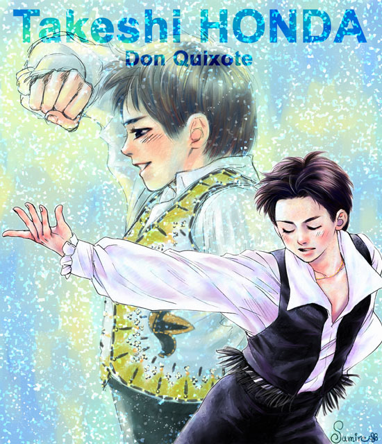 | 2525(ニコニコ)番ゲット、るんさんからのリクエストは 「Don Quixote」のニコニコ武史くん、黒い衣装版でした。 どうゆうふうに描こうかと悩みましたが、どっちも別物で衣装だけ チェンジと言うわけにはいかなくなりました〜。 初期バージョンはジャパンオープンを参考に。すごくのびのびしていてね〜、 リバーダンスの微笑みをほうふつとさせる瞬間がこの時すでにあったんですねえ! 後ろの絵はソルトレイク五輪の最後のポーズで手をあげる瞬間。 オリンピックのSPで、まさかアレほどの笑顔が飛び出ようとは思いもしなくて、 見た瞬間にボロボロ泣いてしまいました。(近年あれだけ泣けたことはないね) その笑顔をずっと見たかったんだなあ〜としみじみ感動しました。 ビッカビカに輝いていましたよね! |